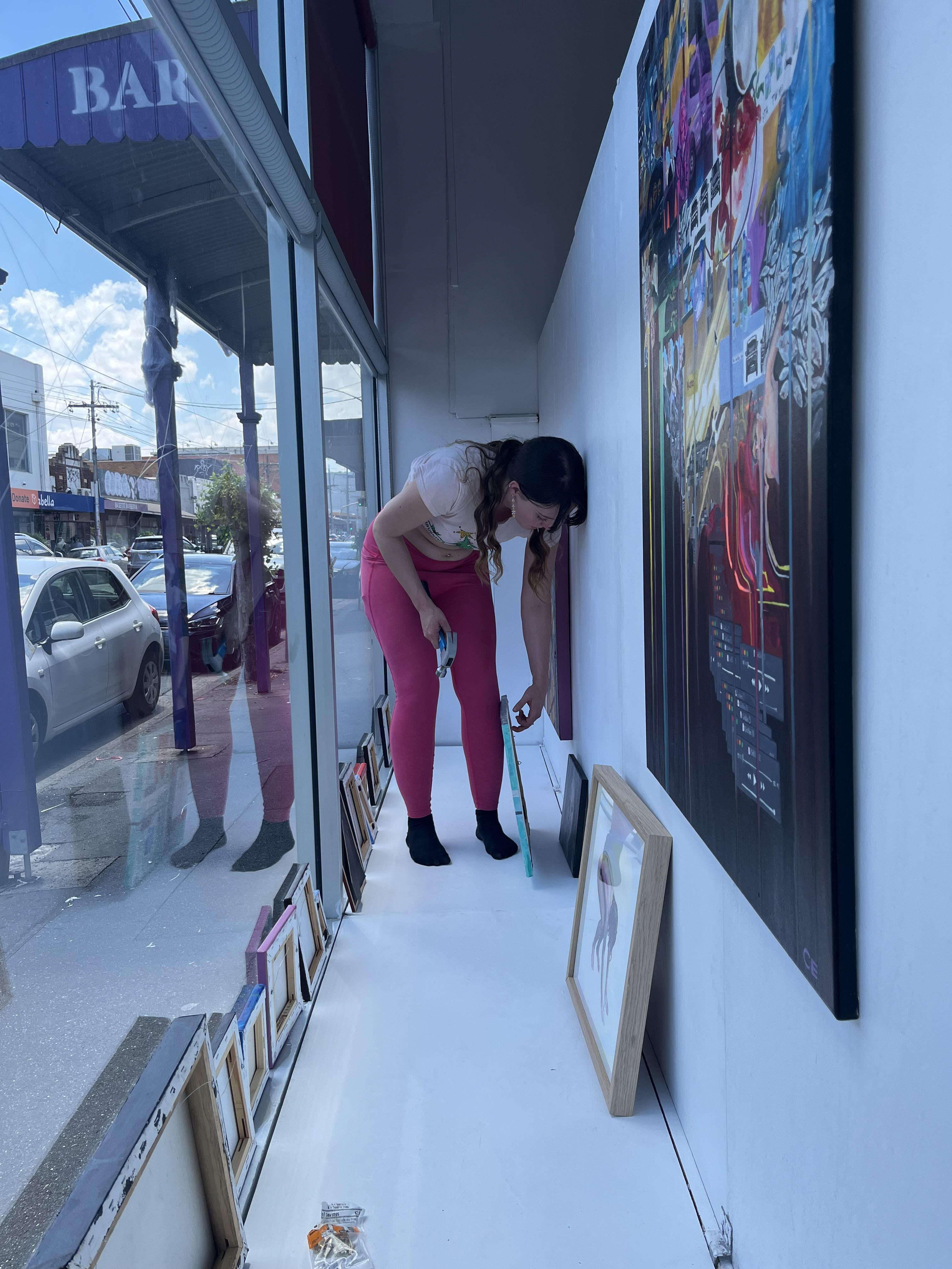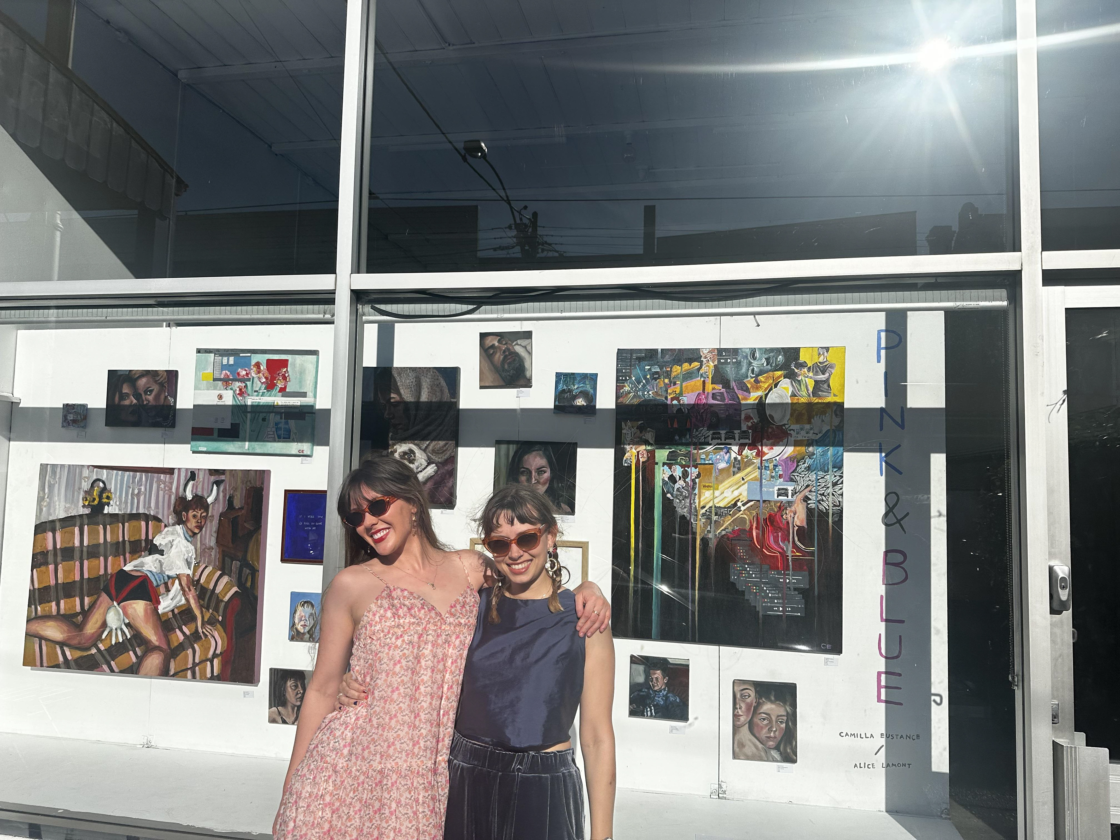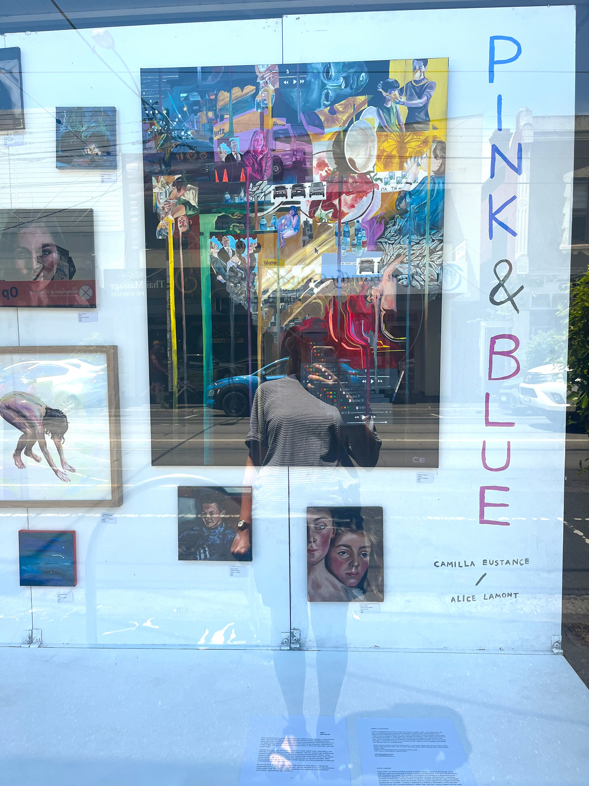 Visually, pink and blue are dominant colours in both artistsβ work, especially in the abstract or representational depiction of selfhood. The two colours also traditionally represent happy/angry/emotive (pink) and sadness/contemplation (blue). Using acrylics and oils, the works created will intersect and divert each other. Alice paints memories of childhood, early adulthood, and femme on femme sexuality, often focusing on everyday scenes, while Camilla depicts the phenomenology of self and nostalgia through an internet lens.