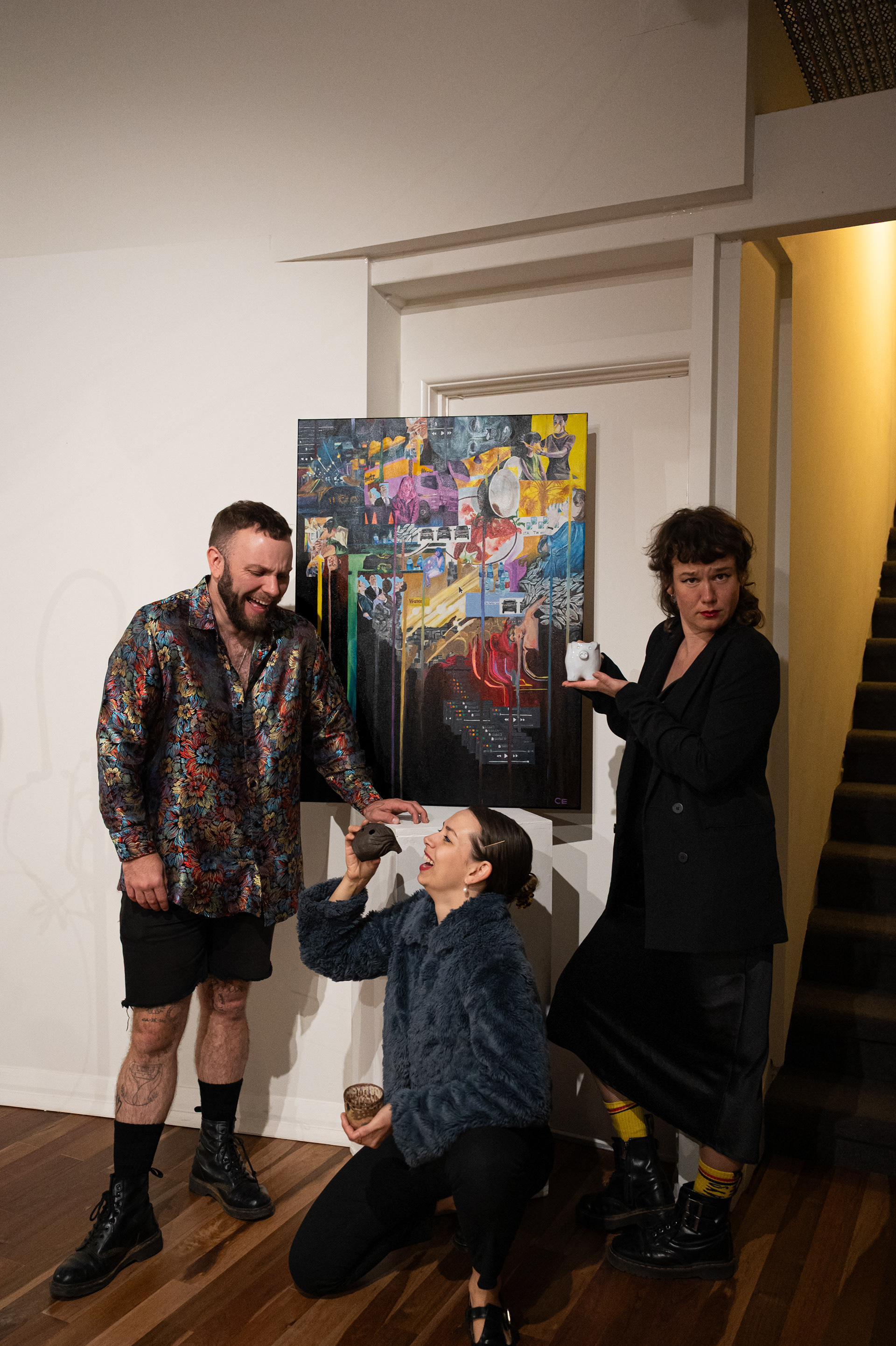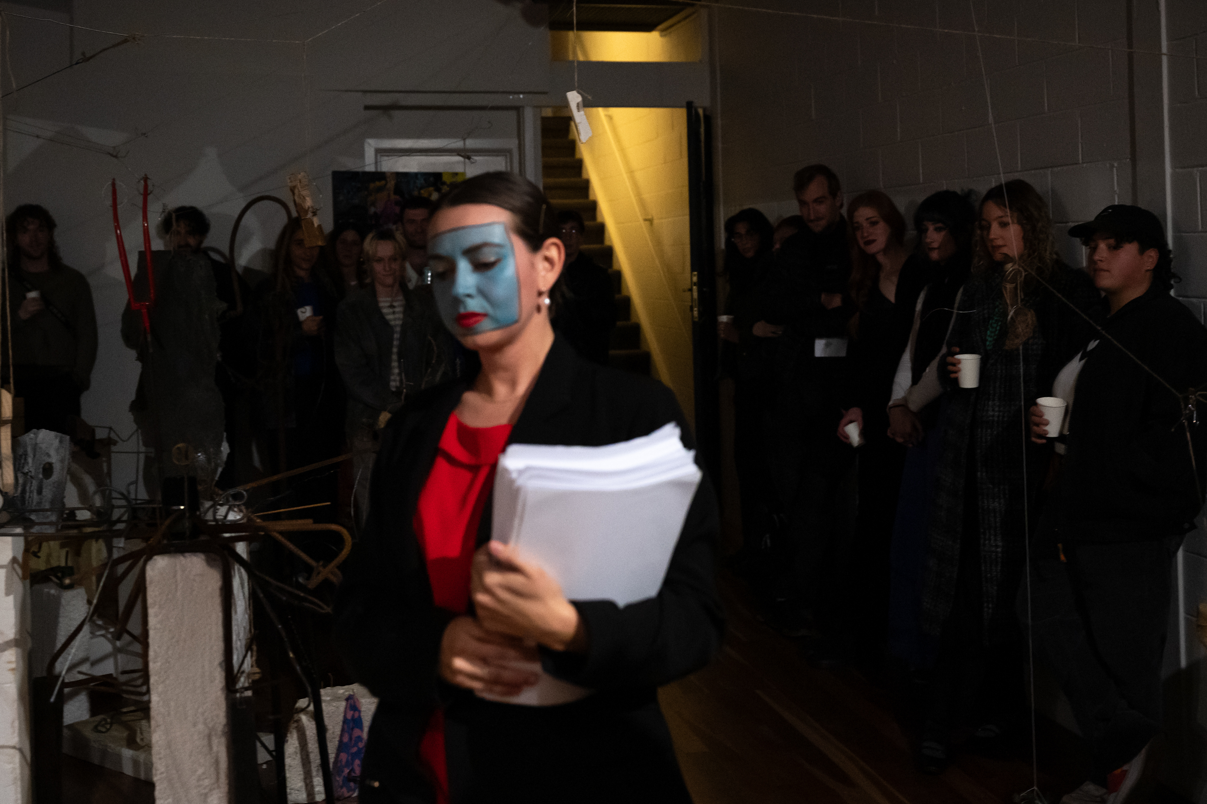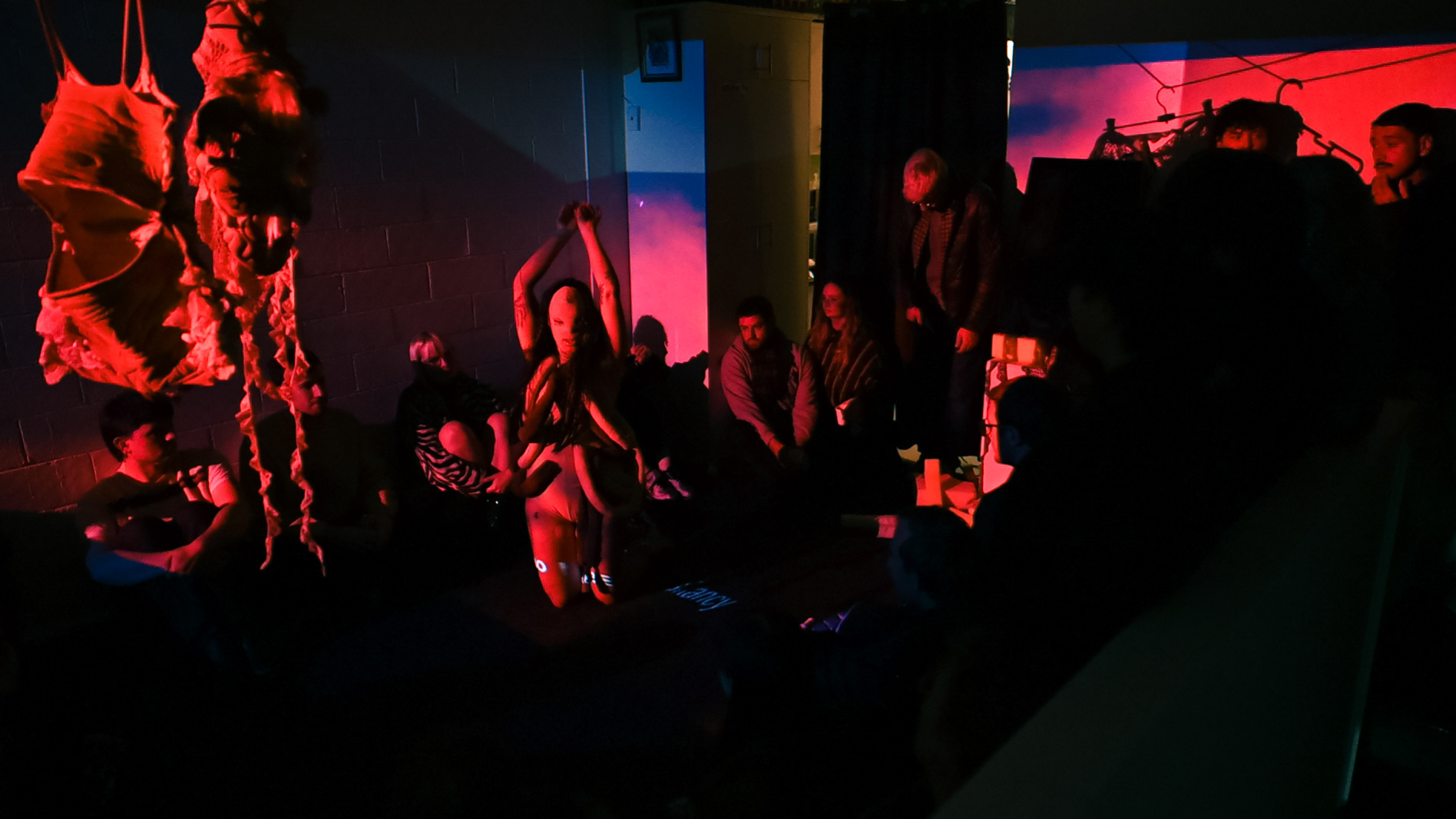 We are happy here in this office. Here in Mixed Zoning we can mix ourselves together. Multi levels multi options infinite configurations lead to infinite moments. You can fold in on yourself here. If you are gentle you can touch entities that welcome your embrace. Mirrored and janky angels guide us, fish in resin, flesh in cloth, the stage is set, pull on the chain pull on the chain. Now hush - they speak. They speak their truths absorbed and integrated through flesh-gathering-world-walking. Scurrying down rivers that were never terraformed, they howl to the moon stark, hysterical, naked. Wearing what they make, a body without rules, a chosen role of other.