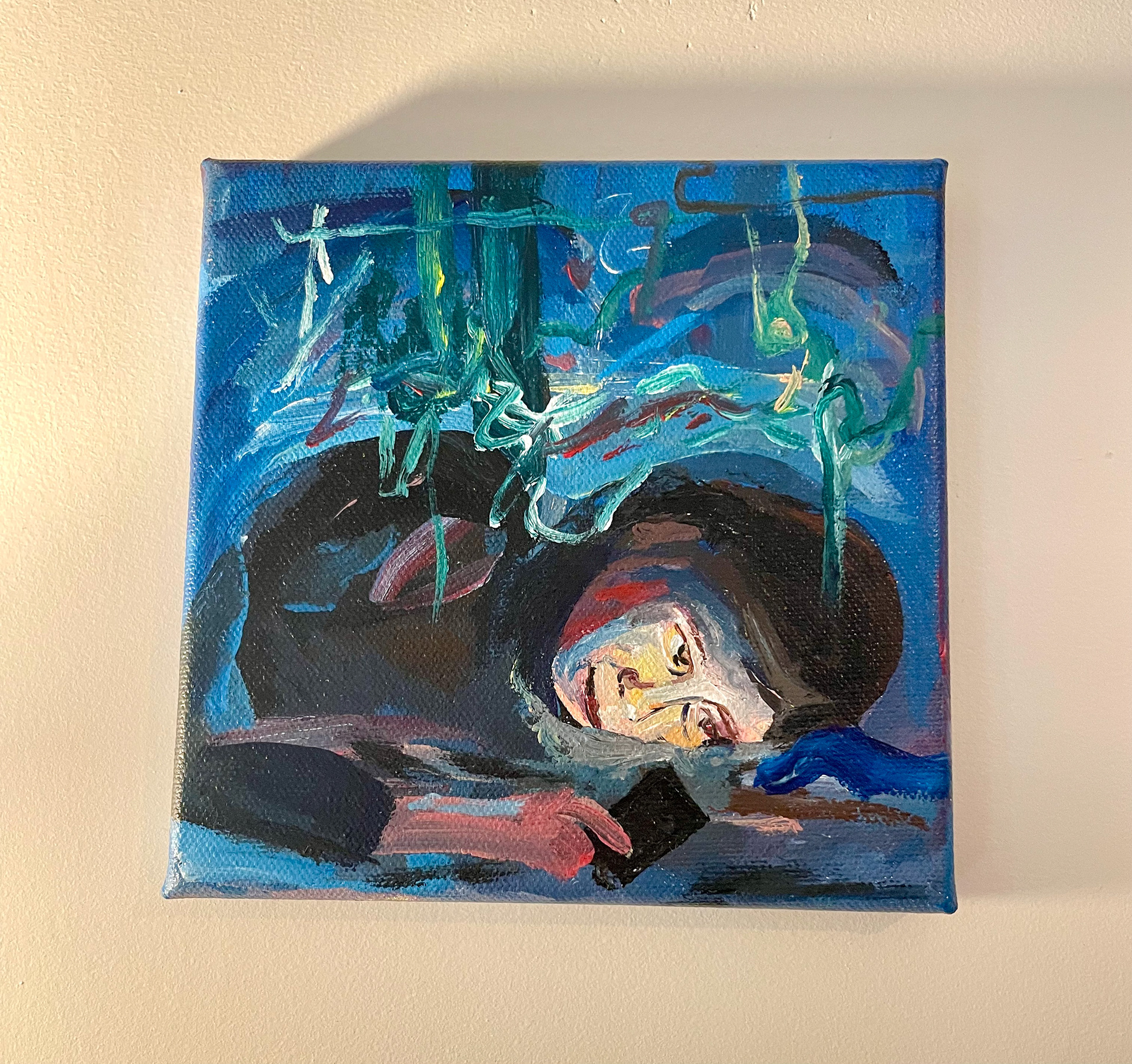 'Mask', acrylic on paper, 560mm x 760mm, 2023. Below from left: '3am', 'The beginning', and 'Start', all acrylic on canvas, 150mmx150mm, 2024.